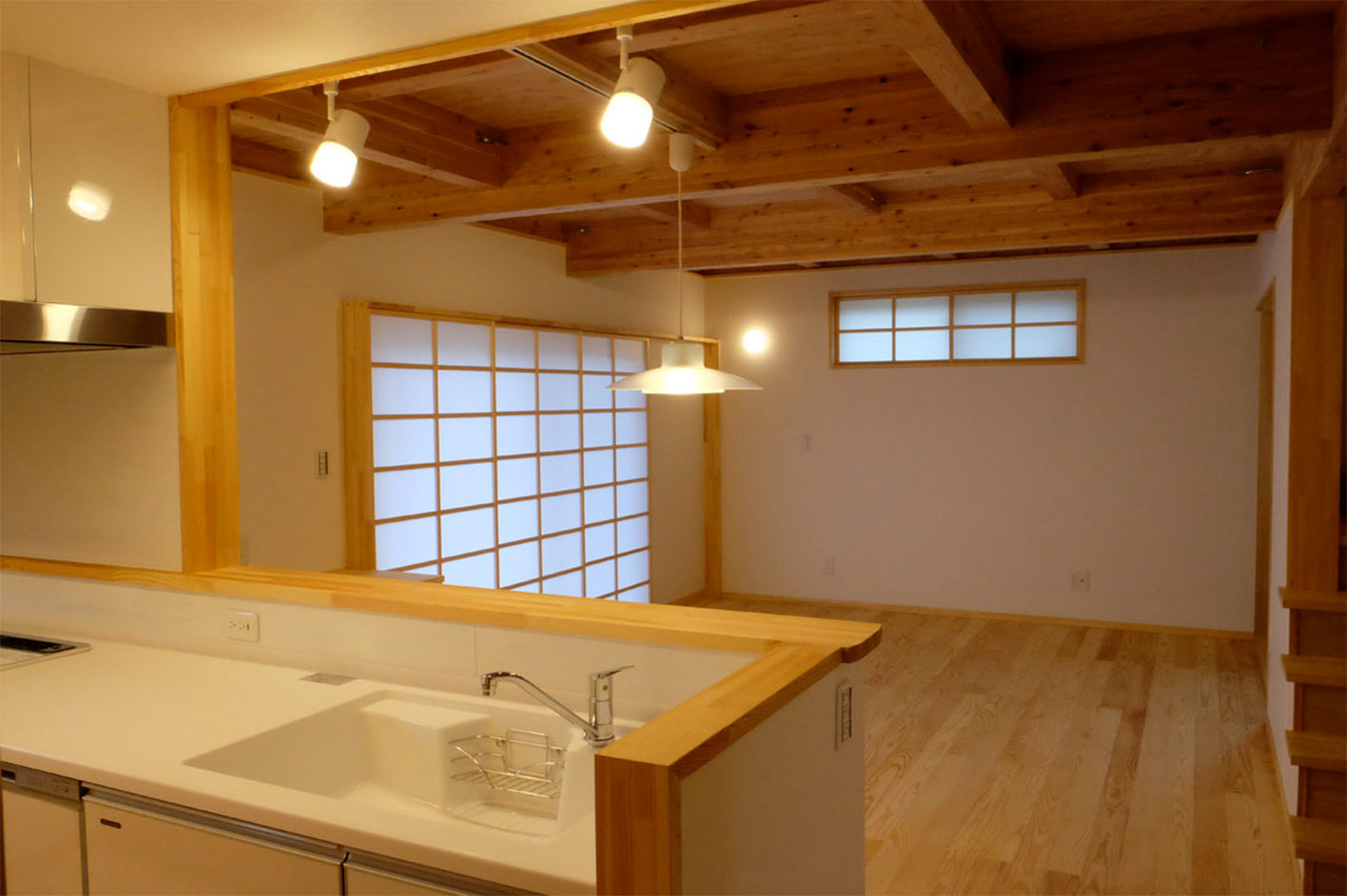 これらのことで家の性能をあげながら、さらに快適な空間とするために仕上げにもこだわり、構造材を岩手県産のカラマツの集成材を使用し、できるだけ現しとしながら、床には岩手県産のアカマツの無垢板、壁には漆喰クリームを塗り、自然素材を多く使った仕上げとした。収納や造り付けの家具も充実させ使い勝手にもこだわったつくりとした。